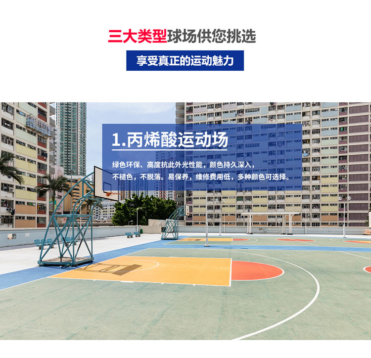 丙烯酸球場涂層系統的共通特性:是完全不含石棉、鉛或水銀等化合物,合乎環保原則。完全綠色環保、高度抗紫外光性能,顏色持久深入,不退色,不脫落。保養容易,維修費用低,在任何氣候條件下都堅固耐用。多種顏色可供選擇,包括藍、紅、深綠和淺綠等。使用壽命長,一般在6年以上,如基礎質量優異其使用壽命還可延長。面層有效舒緩沖力,降低對運動員的傷害及疲勞。國際網球協會(ITF)認可產品,國際比賽場地適用。丙烯酸涂層系統適用于混凝士基礎層與瀝青基礎層,以相宜的價格,提供優質的運動場地面材料。被推崇為最經濟的休閑及專業網球場籃球場地面系統。