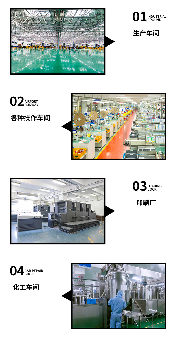 電器、電子、機(jī)械、食品、醫(yī)藥、化工、煙草、飲料、紡織、服裝、家具、塑料、文體用品等制造工廠的車間水泥或水磨石地面。